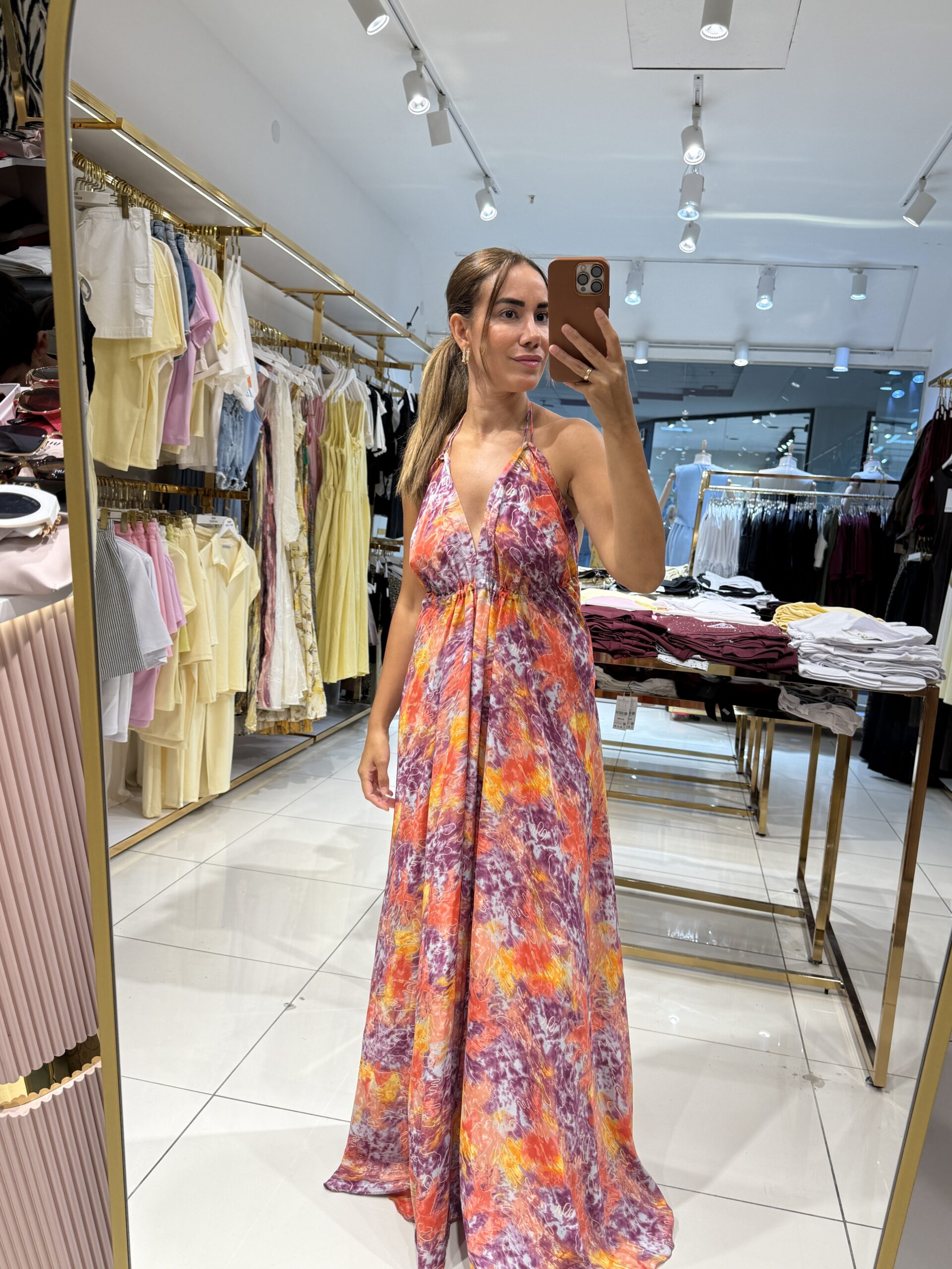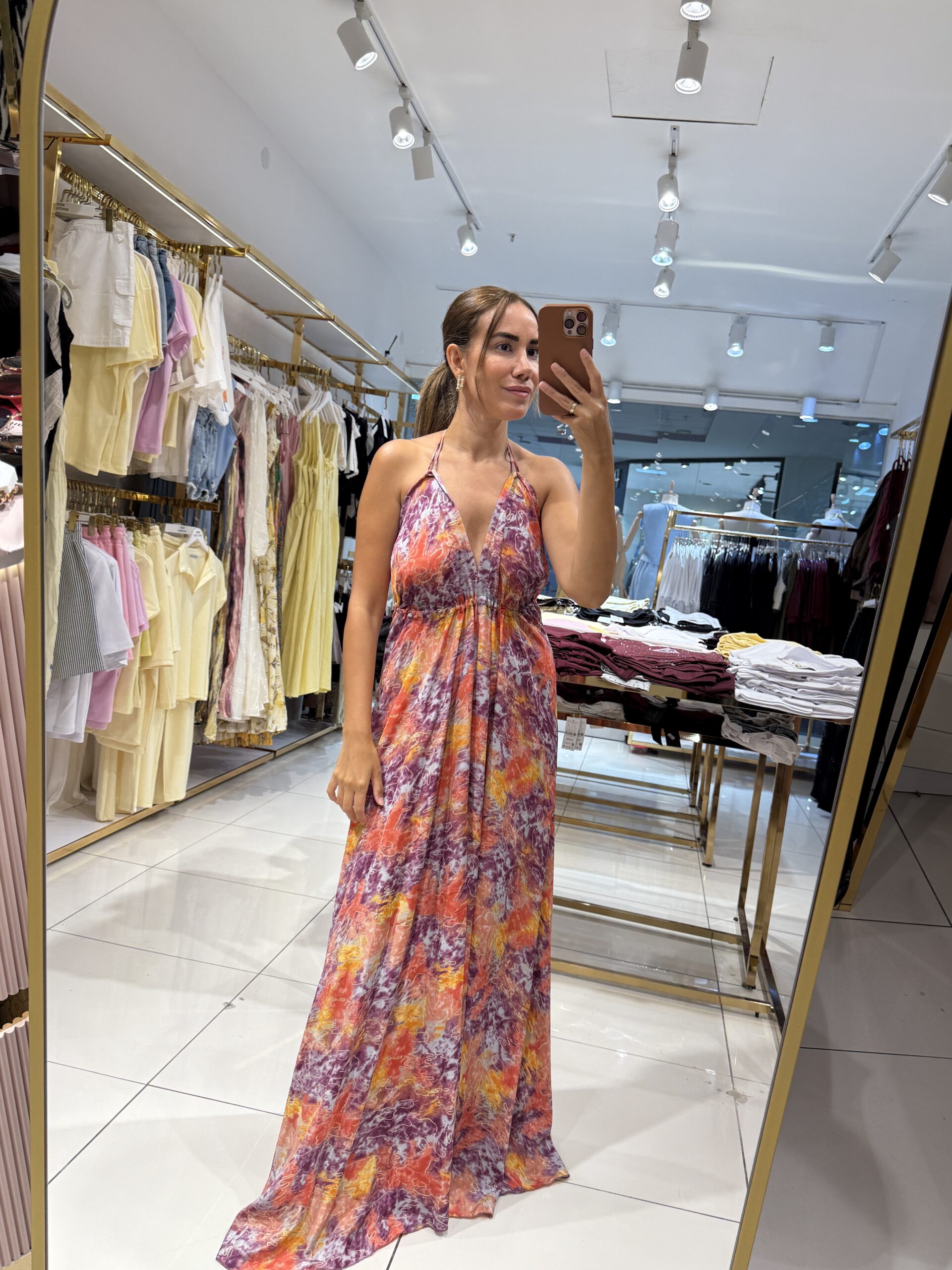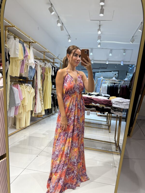 SIRT DEKOLTELİ ETNİK DESENLİ SATEN ELBİSE